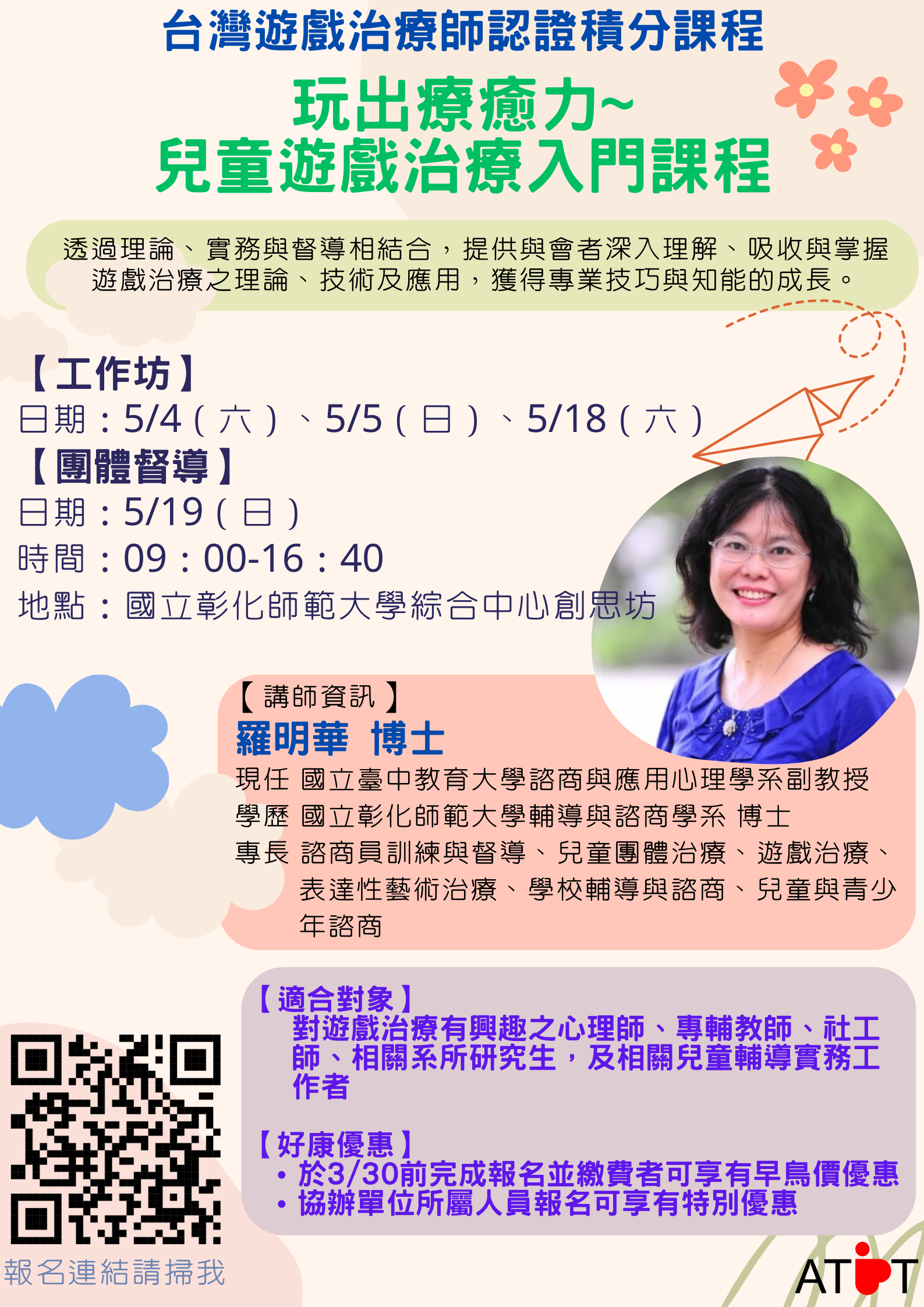 2024台灣遊戲治療師認證積分課程~玩出療癒力~兒童遊戲 治療入門課程活動及時間。 (一)工作坊 1、05/04(六)、05/05(日)、05/18(六),09:00- 16:40,共計三日課程,羅明華博士主講。 (二)團體督導 1、05/19(日),09:00-16:40,共計一日課程,羅明 華博士主講。 (三)課程說明 1、本次課程可選擇參加四日課程(工作坊+團體督導)或 三日課程(僅工作坊)。 2、課程採線上報名,即日起開放報名至4/24止。