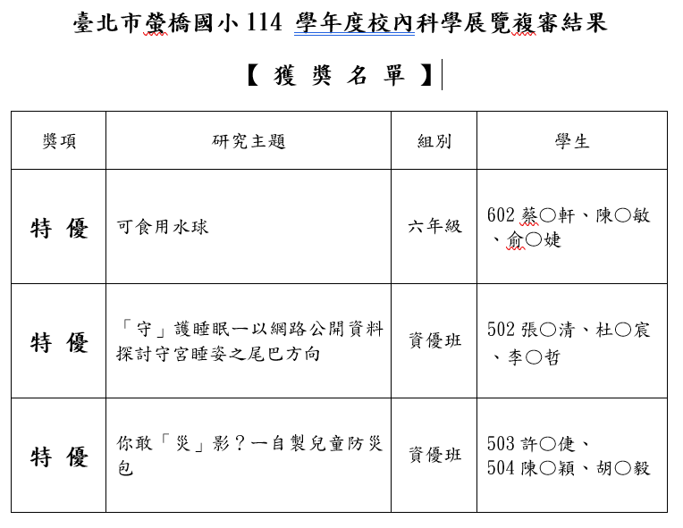 說明:恭喜以下得獎同學!特優隊伍將於下學期代表本校參加臺北市科展競賽。