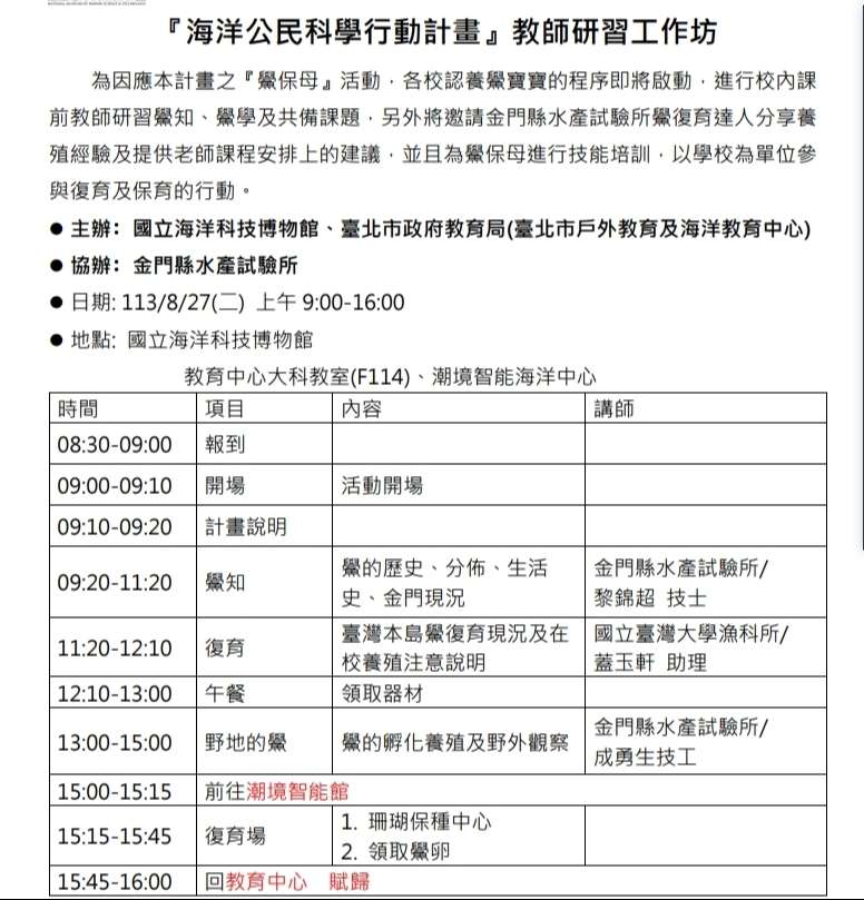 二、研習資訊 (一)時間:113年8月27日(星期二)上午8時至16時00分。 (二)地點: