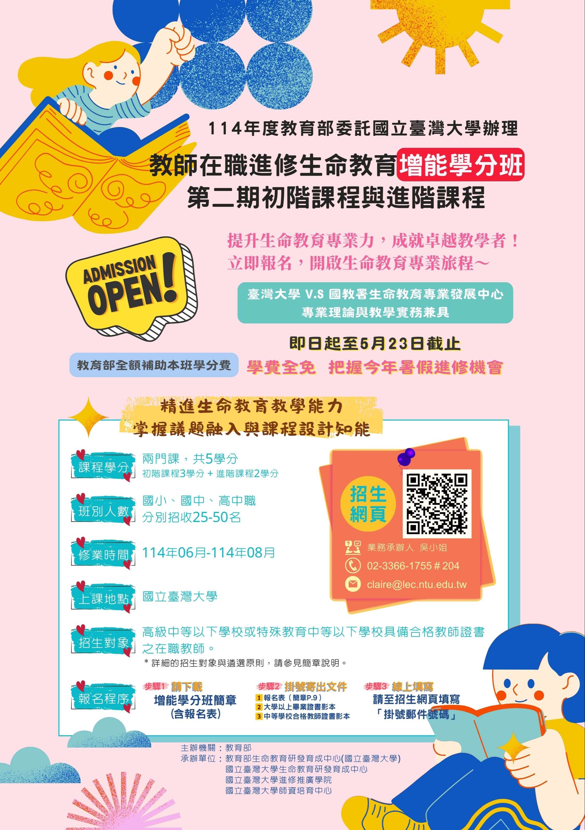 三、本學分班為國小組、國中組及高中職組各1班,皆含初階課 程3學分及進階課程2學分,學費全免,於114年6至8月上 課,詳細資訊請參閱招生簡章。