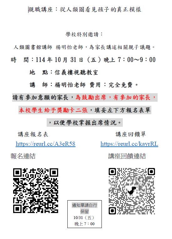 (二)地點:本校信義一樓視聽教室 (三)報名文宣及相關連結請參閱附件,相關問題亦可電洽輔導室楊主任02-2812-9586#841。