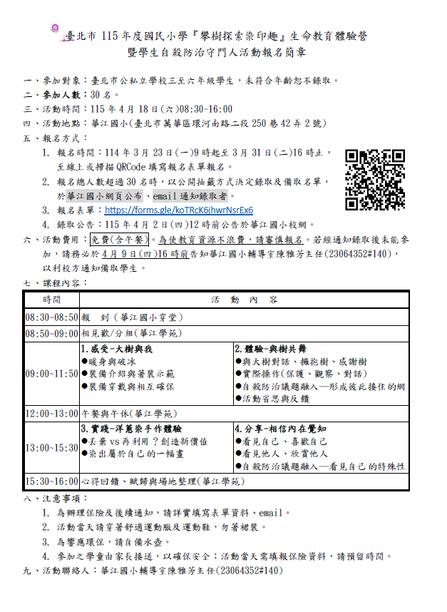 活動及報名訊息如下: (一)參加對象:臺北市公私立學校三至六年級學生,計30 名。 (二)活動時間:115年4月18日(六)08:30-16:00。 (三)活動地點:華江國小。 (四)報名方式: 1、報名時間:115年3月31日(二)16時前,至線上或掃描QRCode填寫報名表單報名。 2、報名總人數超過名額時,以抽籤方式決定錄取及備取 名單,於4月2日(四)華江國小網頁公布並email通知錄 取者。 (五)活動費用:免費。為使教育資源不浪費,請審慎報名。 若錄取後因故放棄,請務必於4月9日(四)16時前告知華 江國小輔導室陳雅芳主任(23064352#140),以利校方通 知備取學生。